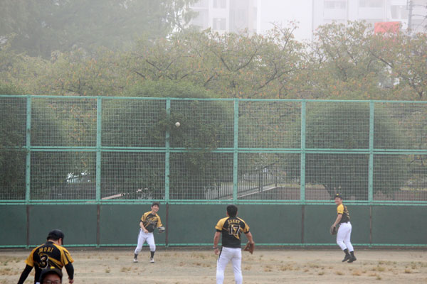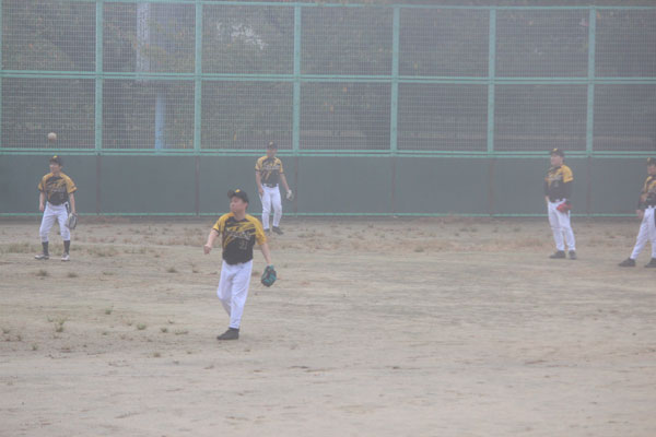 | 試合前の練習中は、前日の雨の影響か、 グラウンドが霧で真っ白でした |