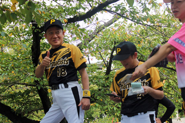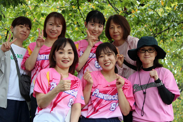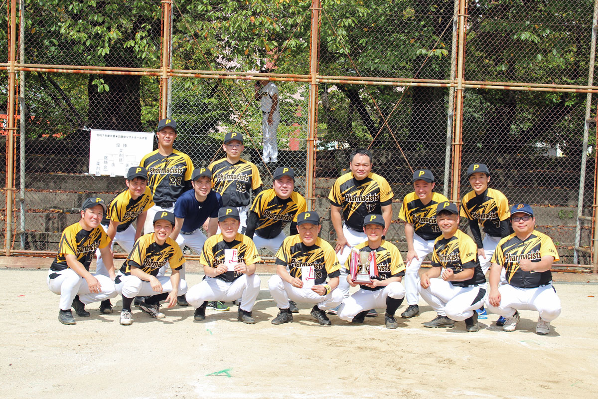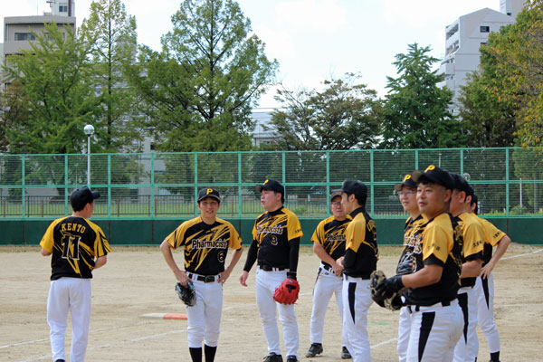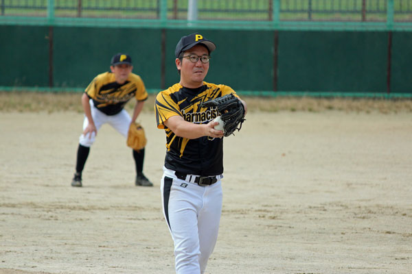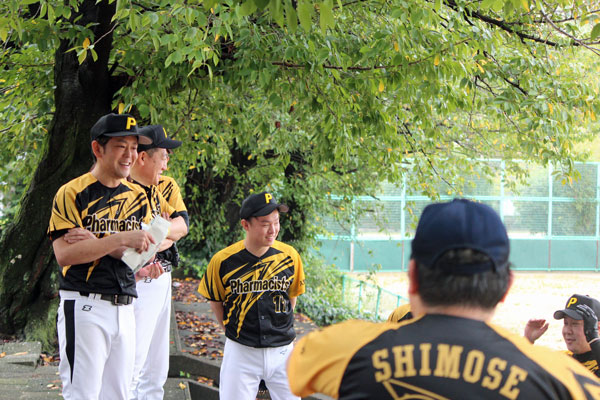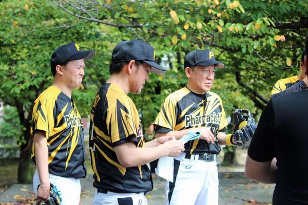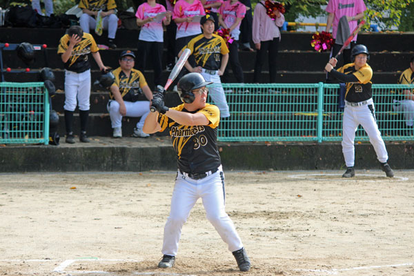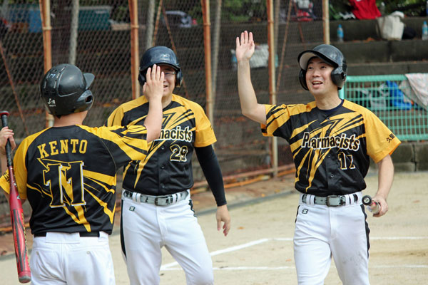 しかしその裏、なんと、目には目を! 1番バッターの期待のホープ田中選手がソロホームラン! これで一気に盛り上がる薬剤師チーム |