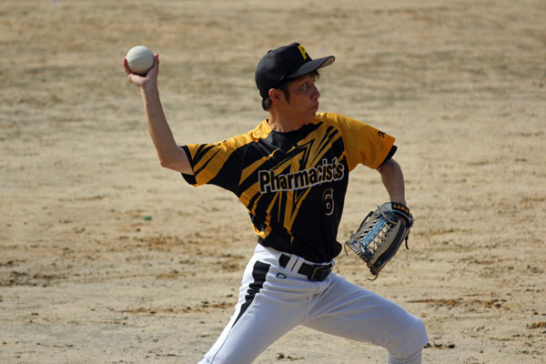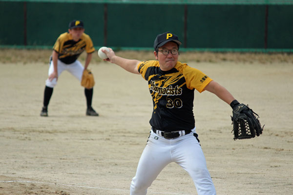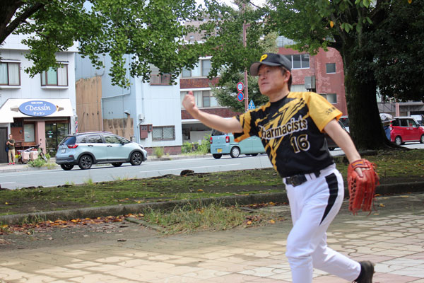 | 試合前の調整も念入りな 薬剤師会の守護神、塚本選手 |