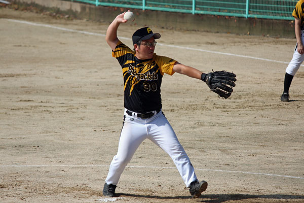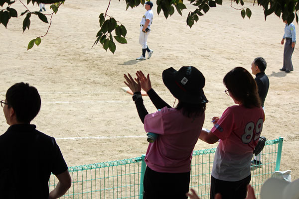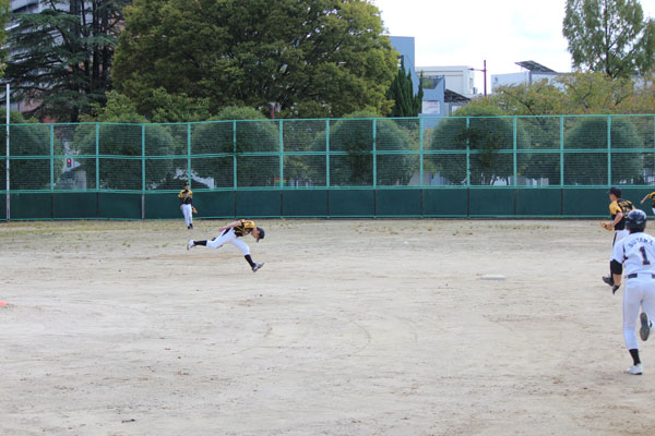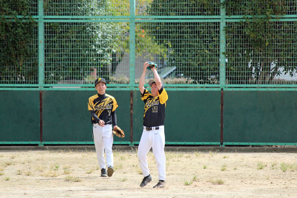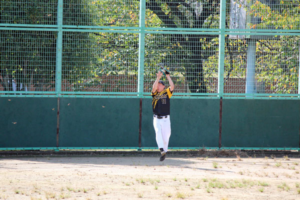 4回裏、2アウト満塁の大ピンチでしたが、 田中選手のナイスキャッチで3アウト、試合終了! |